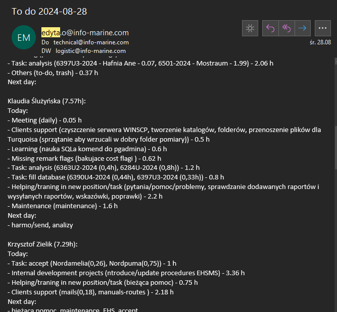 Zdaje się że jest jakiś błąd, mam przypisane taski i czasy Klaudii Ś. z 28.08. Proszę o weryfikację, w załączeniu scr z todo oraz mail wygenerowany 28.08.