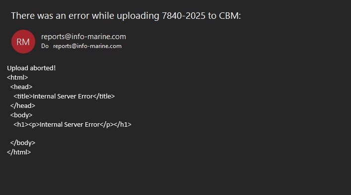 PG: Cześć podczas robienia task check interface dla 7840-2025 Ertugrul Gazi zauwazyłem ze raport nie chce sie przesłać do CBMu, probowałem usunięcia raportu, zaktualizowania source constants, zaktualizowania ship data i wrzucenia jeszcze raz i nadal ten sam bład i nie chce się pojawić w CBMie, w załączniku screen shot z wiadomość na mailu o błedzie