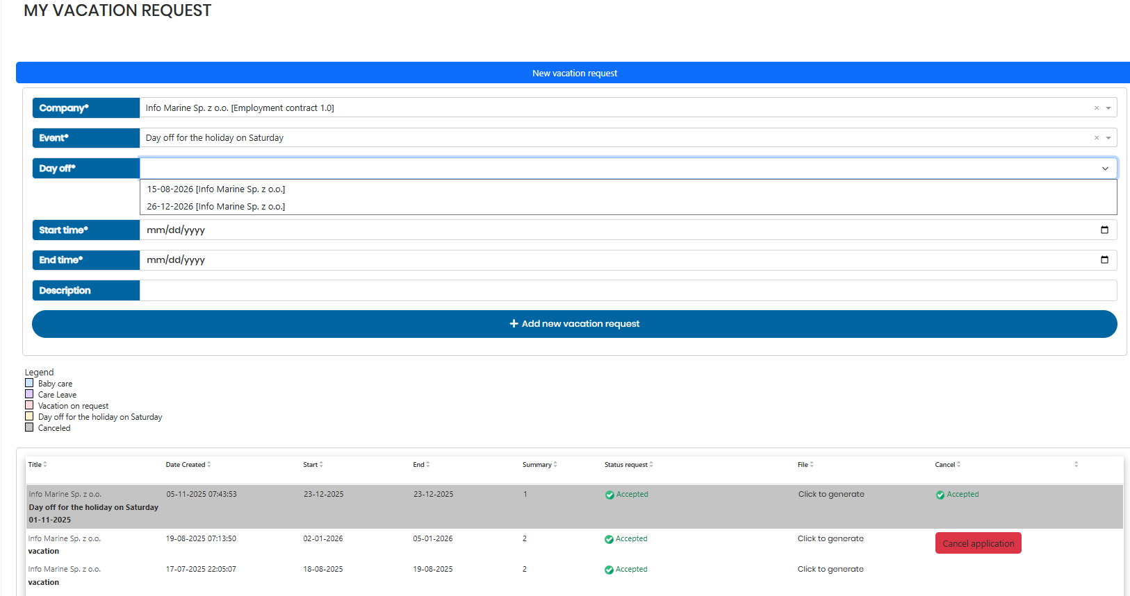 Jakub Kraszewski: miałem złożony i zaakceptowany wniosek o wolne na 23.12 za sobotę 1 listopada. anulowałem ten wzniosek bo postanowiłem jednak wziąć wolne w sylwestrea. Anulowałem wniosek w erp, Klaudia zaakceptowała to anulowanie. I teraz jak chcę złożyć nowy wniosek o wolne za sobotę to na liście dostępnych sobot nie pojawia się 1 listopada.