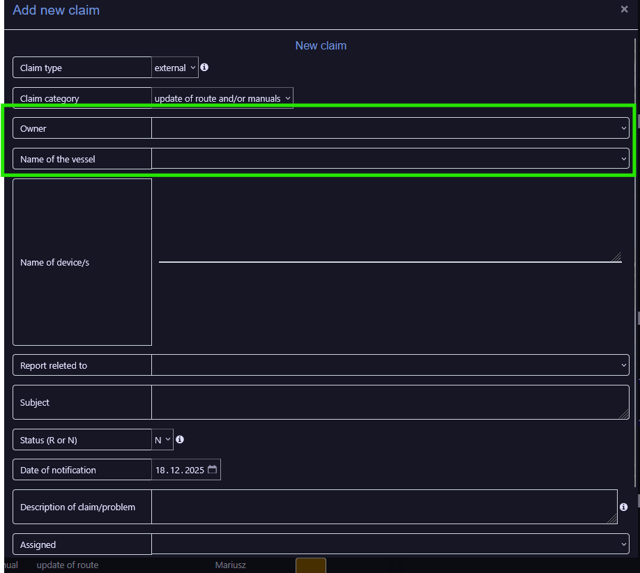 CSP: An error occurred while adding external claim for Hafnia Amessi to update route and manuals as crew confirmed the addition of new machineries. > This is task instructed by senior NK