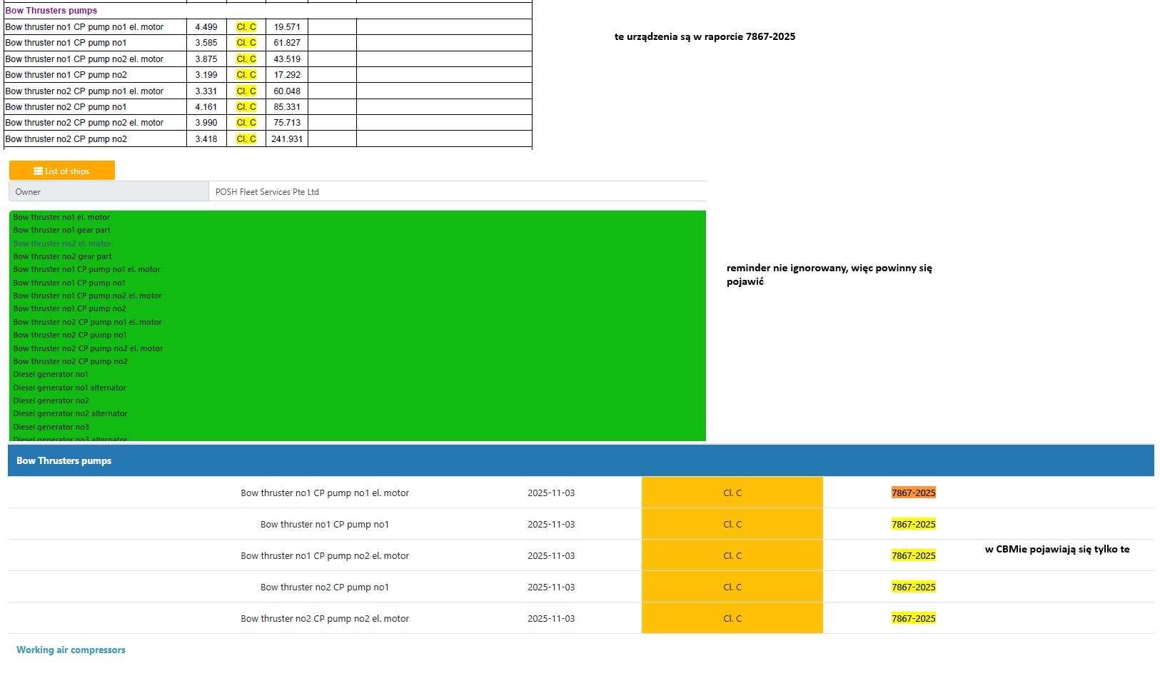 PG: Hejka, podczas robienia check interface z raportu 7867-2025 POSH Elegance, zauwazyłem że nie pokazuje wszystkich urządzeń w List of machinery with alerts, które tam powinny być. Czasem na liscie jest jedno urzadzenie z setu a czasem jeden set z trzech/dwóch. Probowałem aktualizować ship data, usuwałem raport i wgrywałem jeszcze raz, aktualizowałem też source constants. Sprawdzałem tez liste machinery with error i overdue tam równiez ich nie ma. Złączam screena z przykładami (to tylko kilka urzadzeń przykładowych, nie pojawia sie ich więcej).