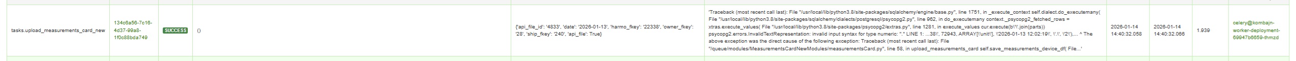 'Traceback (most recent call last): File "/usr/local/lib/python3.8/site-packages/sqlalchemy/engine/base.py", line 1751, in _execute_context self.dialect.do_executemany( File "/usr/local/lib/python3.8/site-packages/sqlalchemy/dialects/postgresql/psycopg2.py", line 962, in do_executemany context._psycopg2_fetched_rows = xtras.execute_values( File "/usr/local/lib/python3.8/site-packages/psycopg2/extras.py", line 1281, in execute_values cur.execute(b\'\'.join(parts)) psycopg2.errors.InvalidTextRepresentation: invalid input syntax for type numeric: "." LINE 1: ...38\', 72943, ARRAY[\'unit\'], \'2026-01-13 12:02:19\', \'.\', \'2\'),... ^ The above exception was the direct cause of the following exception: Traceback (most recent call last): File "/queue/modules/MeasurementsCardNewModules/measurementsCard.py", line 58, in upload_measurements_card self.save_measurements_device_df( File...'